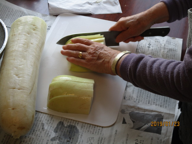 今日は大きな大根を貰ったので干し大根作りをしました。まず、大根を切って・・・